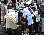 さすがにこの時間になると各売店は大忙し。![]() 地元の農産品を実演販売している餅売場では杵と臼を使っておもちをつき、あんこが中に入ったお団子を実演販売しています。 ![]() 他の売店も忙しそうにしています。休憩テントで食事をしている人もたくさんいます。 そうこうしているとバンドの演奏も終わり、次は仕込み体験です。 ステージ前に移動します。 ステージ上に仕込み桶といって貯蔵樽を半分に切ったような桶が3つ並んでいます。 その中に先程収穫したぶどうを入れて人が足で踏んでぶどうをつぶします。 |
