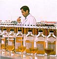| 熟成に影響を与える天候や年によって一定ではありません。仮に一定にできたとしても、化学分析の結果は貯蔵してから10年、20年も経たないと得られないのです。こうしてみると、熟成とはオークという木とウイスキーとの間で繰り広げられる、年月をかけた神秘のドラマだということがわかります。恵まれた自然環境に抱かれ、ウイスキーは樽の中で眠る。つまり自然というゆりかごの中でウイスキーは成長し、個性を磨いていくのです。 そして、樽は麦や水や酵母と並んでウイスキーの原料そのものといっても良いでしょう。(白州蒸留所パンフより引用) さて、見学コースはここで終了し、後は試飲会場で皆さんお待ちかねの試飲となります。しかし、製造工程はもう少し続きますのでお付き合い下さい。 6.ブレンド・・・ 熟成したモルトウイスキーはひと樽ごとに個性が違います。ブレンダーは多彩な個性を組み合わせ、めざす製品のモルトの個性に仕上げます。これにさらにグレーンウイスキーを合わせて、まろやかな風味に仕上げることをブレンドといいます。 |