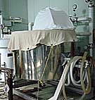 これが放冷機の全体写真です。![]() 写真右端が蒸米機の最後、お米が蒸されて出てくる場所で、中央に写っている放冷機にそのまま流れていきます。 放冷機を反対側から見てみましょう。 ![]() これが放冷機の端で、ここからお米が出てくるまでに、用途に応じて適温に冷やすわけです。麹米なら約40度Cまで冷やします。 この放冷機の脇には、昔ながらの和釜にセイロの組み合わせの「こしき」ではありませんが高級酒を造るときに使う最新型の「回転式こしき」がありました。 |